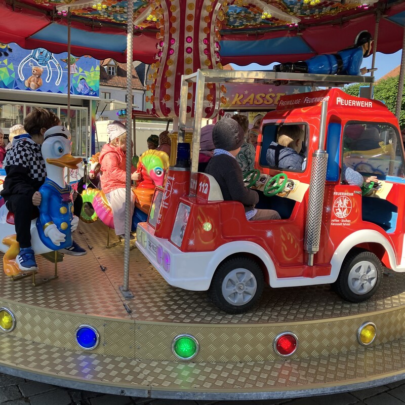 Nach dem „Pfreimder Kirwawochende“ durften die Kindergartenkinder auf Einladung der Karussellbesitzer zum Marktplatz kommen und mit dem Zug bzw. mit dem Karussell fahren. Die Vorfreude war groß und so kletterten sie, je nach Vorliebe, auf die Biene, stiegen in die drehende Tasse oder fuhren stolz im Feuerwehrauto Runde für Runde.