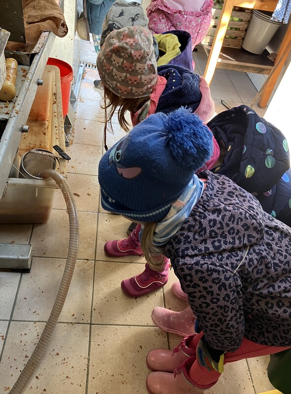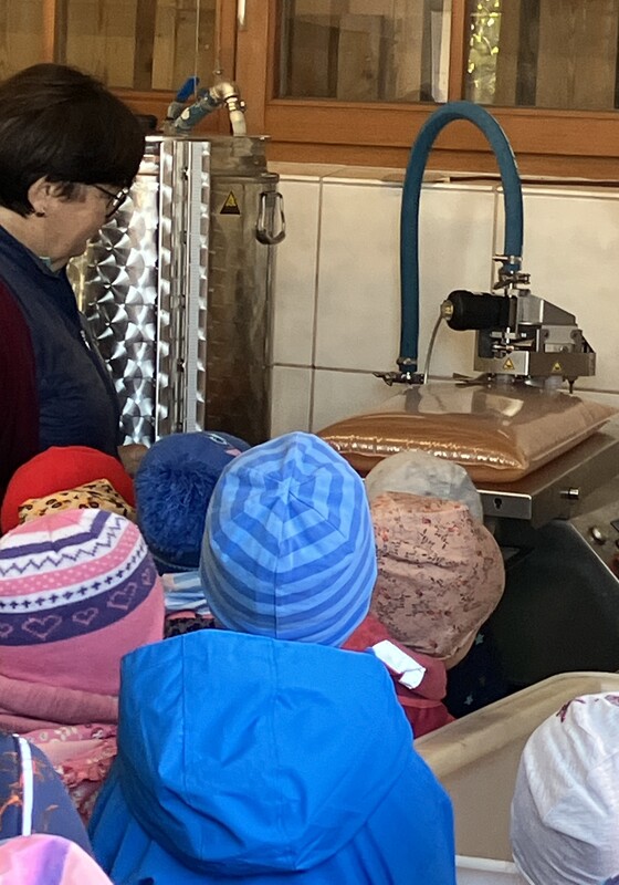 Am Mittwoch stand dann der Termin in der Pfreimder Mosterei an. Die Vorschul- und Mittelkinder durften dabei zusehen, wie aus den geernteten Äpfeln Apfelsaft entstand. Gespannt beobachteten sie, wie die Äpfel zunächst sortiert wurden, bevor sie im „Apfelbad“ gewaschen wurden. Dann wurden die Äpfel geschnitten, in Rahmen gefüllt und aufeinandergestapelt, bevor diese per Hydraulik zusammengepresst wurden. Fasziniert beobachteten die Kinder, wie der Saft über die Rahmen lief, aufgefangen wurde und über Schläuche in großen Auffangbehälter gesammelt wurde.